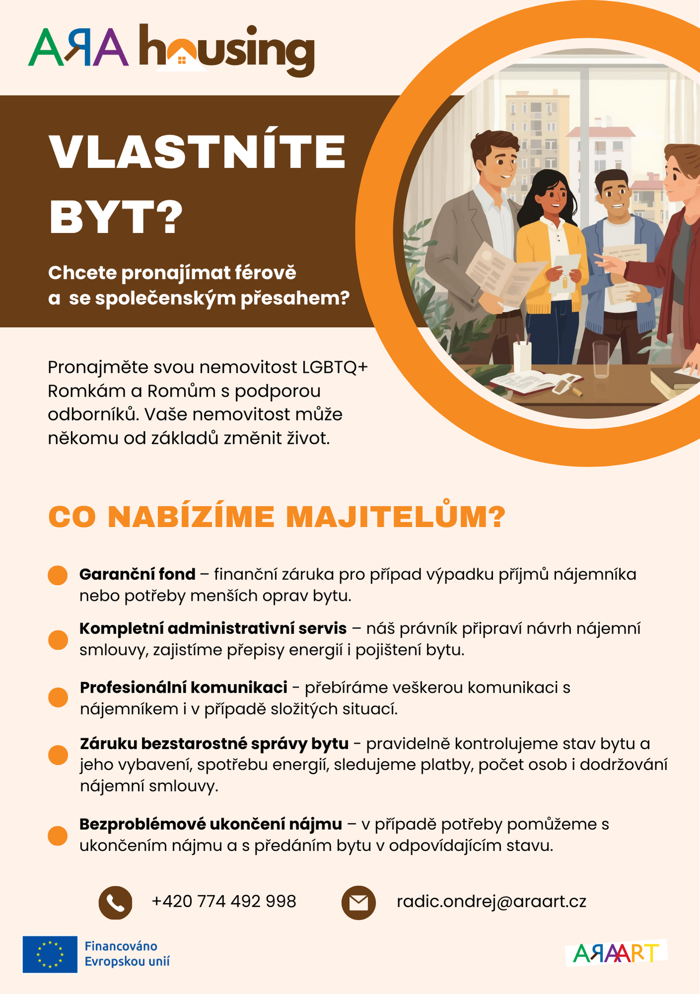 Hledáme majitelky a majitele bytů, kteří chtějí mít spolehlivé nájemnice a nájemníky, příjem a bezproblémovou správu bytu. Spolupracujte s námi a přispějte k tomu, aby LGBTQ+ Romky a Romové v bytové nouzi našli důstojné bydlení a novou šanci na stabilní život. Vy získáte bezpečný pronájem a profesionální servis, my zajistíme všechno ostatní.